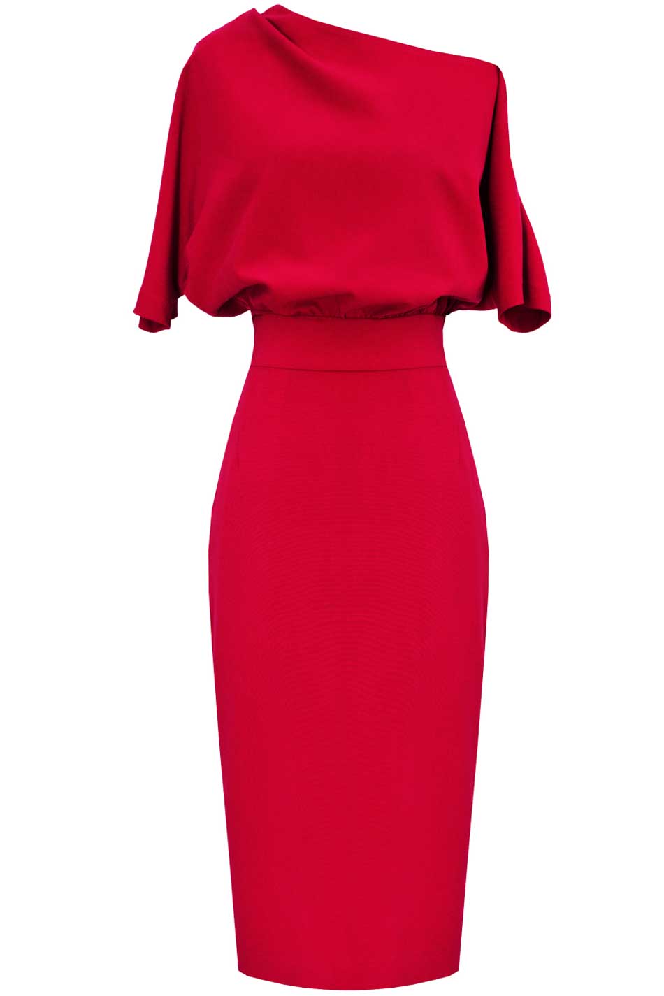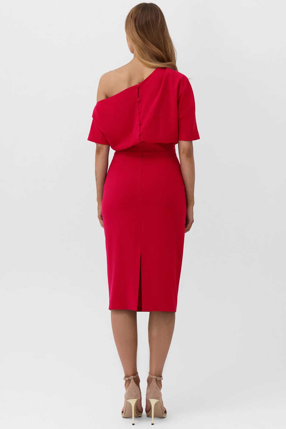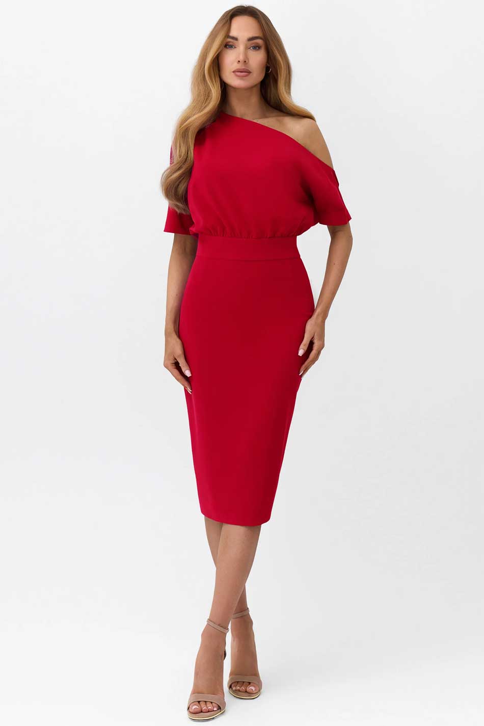 Sukienka Violette czerwona to elegancka i wyrazista propozycja, która przyciąga uwagę intensywnym kolorem i dopracowaną formą. Nasycona czerwień nadaje jej charakteru i sprawia, że idealnie wpisze się w stylizacje na wyjątkowe okazje. Krój tej sukienki zaprojektowany został z myślą o podkreśleniu kobiecej sylwetki – lekko opływająca góra z asymetrycznym dekoltem subtelnie odsłania jedno ramię, wprowadzając nutę nowoczesnej elegancji. Talia tego modelu jest wyraźnie zaakcentowana, co optycznie wysmukli figurę, natomiast dopasowany dół harmonijnie podkreśli biodra. Kreacja ta zapinana jest z tyłu na niewielkie, oblekane tkaniną guziczki, które stanowią delikatny, dekoracyjny detal. Elastyczna podszewka, na której został odszyty ten model, zwiększa komfort jego noszenia i sprawia, że sukienka ta idealnie dopasowuje się do ciała, zapewniając swobodę ruchów. Sukienka Violette czerwona doskonale sprawdzi się podczas eleganckich przyjęć, uroczystości rodzinnych czy wieczornych wyjść, oferując połączenie klasy, wygody i efektownego stylu. SUPER!