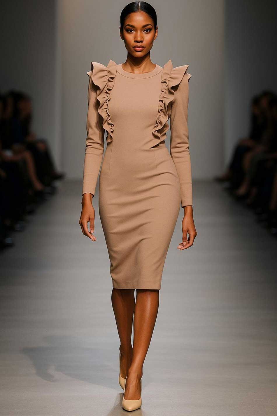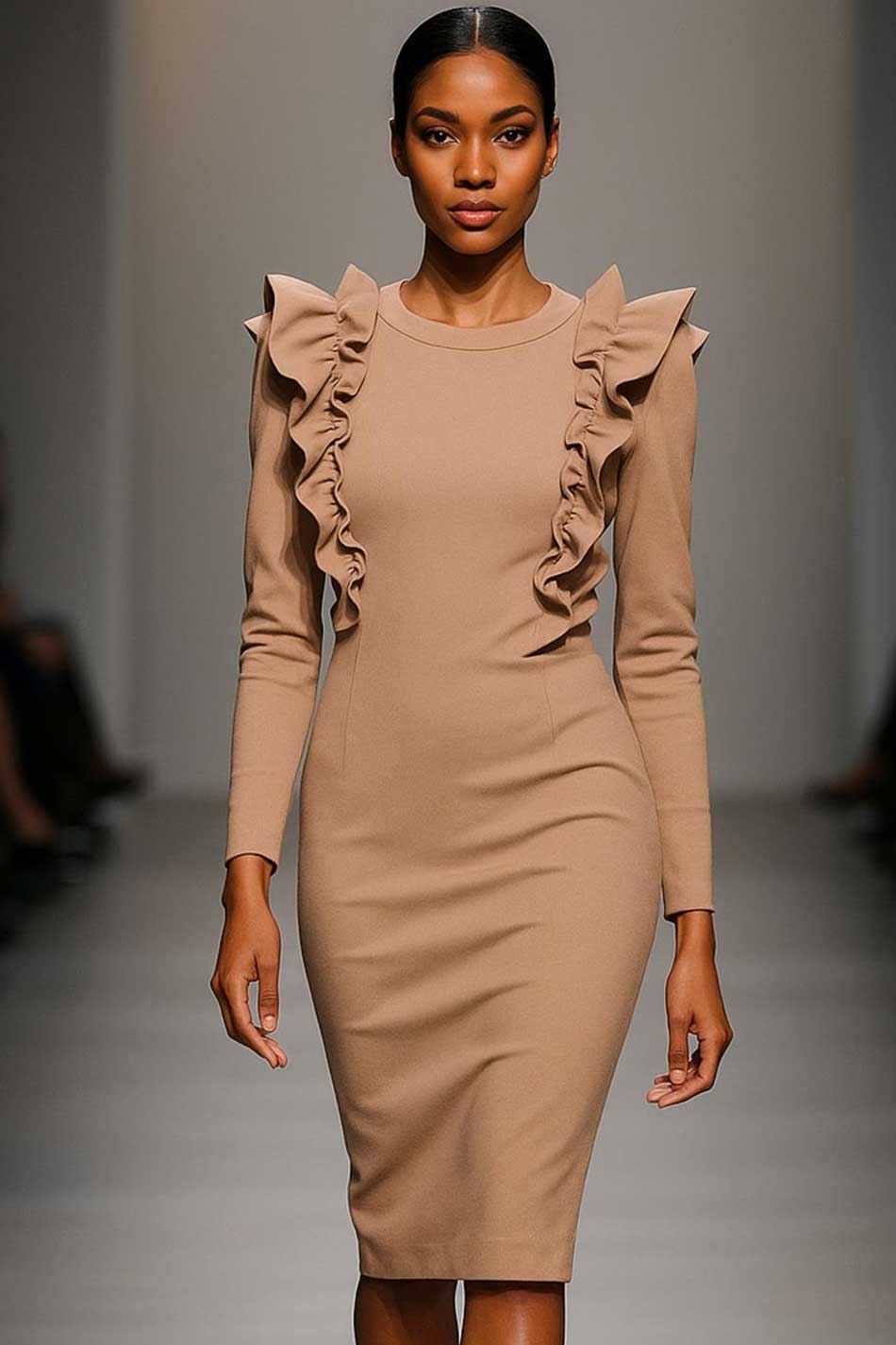 Piękna ołówkowa sukienka midi w kolorze beżowym z ozdobnymi naszytymi falbanami z przodu, które dodają kobiecości i zmysłowości. Sukienka ma klasyczny, dopasowany krój, jest zwężana ku dołowi. Pionowe linie zaszewek podkreślają i modelują sylwetkę. Sukienka wykończona okrągłym dekoltem, ma długie rękawy i jest zapinana na zamek z tyłu. Wykonana z naturalnej dzianiny wysokiej jakości, bardzo precyzyjnie odszyta. Będziesz w niej wyglądać świetnie na różnego rodzaju uroczystościach. WYRAFINOWANA!
