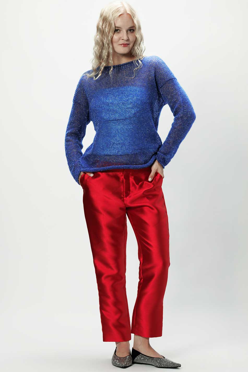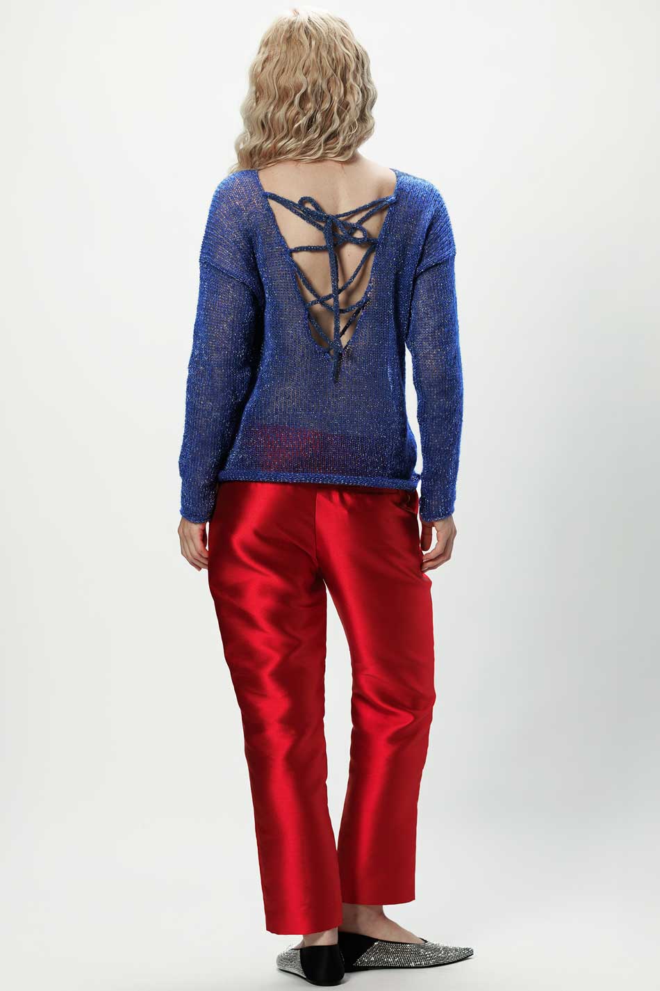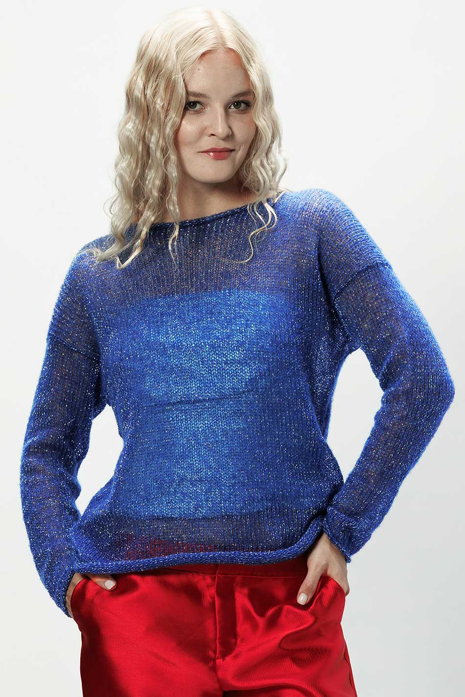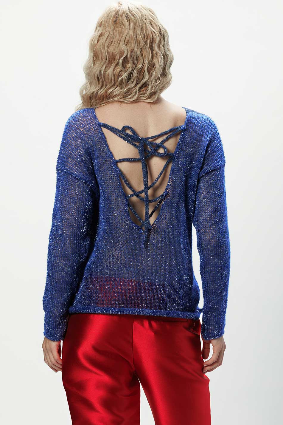 Sweter Flora w wyjątkowym odcieniu intensywnego chabru ze srebrzystą nitką to model, który łączy nowoczesny design z elegancją. Jego fason, z prostą linią i długimi rękawami, został przełamany głębokim wycięciem na plecach, zakończonym ozdobnym wiązaniem, które przyciąga wzrok i podkreśla subtelną kobiecość. Model ten został wykonany z miękkiej przędzy z alpaki, która daje niezwykłe poczucie komfortu, a dodatek włókien syntetycznych sprawia, że sweter ten zachowuje formę i łatwo się go pielęgnuje. Każdy egzemplarz swetra Flora alpaka chaber srebro wykonywany jest ręcznie w duchu ekologicznej produkcji – bez użycia prądu, bez odpadów, z pełnym wykorzystaniem surowców. Sweter ten z powodzeniem odnajdzie się zarówno w codziennych, jak i okazyjnych stylizacjach. Dodatkowo, model ten można spersonalizować, zamawiając go w innym rozmiarze, czy kolorze, co pozwoli idealnie dopasować go do swojego indywidualnego stylu. W 100% KOBIECY!