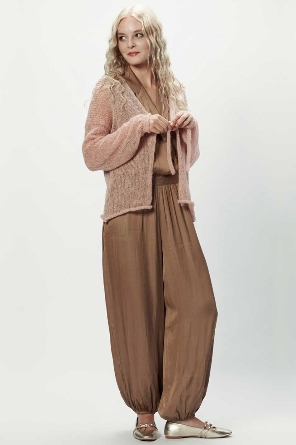 Sweter Viktoria alpaka jasny róż złoto to romantyczna propozycja, która wniesie do stylizacji świeżość i lekkość. Jasnoróżowy odcień tego swetra, przełamany złotą, nitką tworzy subtelny połysk i kobiecy urok. Fason swetra Viktoria alpaka jasny róż złoto, z wiązaniem z przodu prezentuje się niezwykle lekko i pozwala podkreślić naturalną sylwetkę, a jednocześnie daje wiele możliwości stylizacji. Wysokiej jakości przędza z alpaki z domieszką włókien syntetycznych, z której został wykonany ten model, zapewnia przyjemną miękkość, trwałość i łatwość w pielęgnacji. Każdy egzemplarz tego swetra wykonywany jest ręcznie w Polsce, w procesie przyjaznym środowisku – bez odpadów, bez użycia prądu, z poszanowaniem rzemiosła i natury. Model ten można dodatkowo spersonalizować – dopasowując kolor, rozmiar czy wybierając dodatki takie jak pasek, kaptur lub kieszenie. UROCZY BLASK!