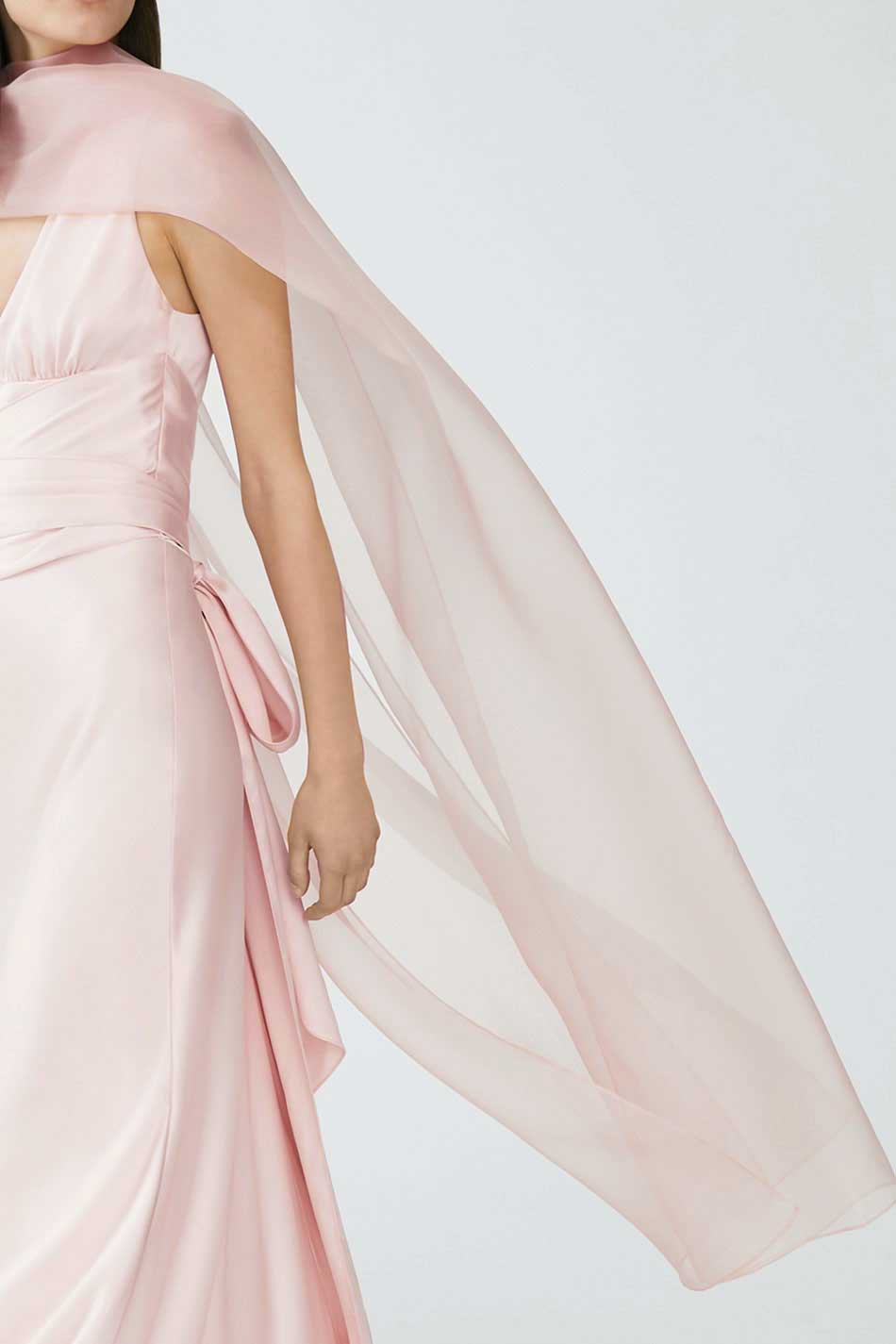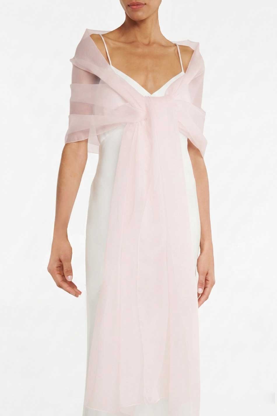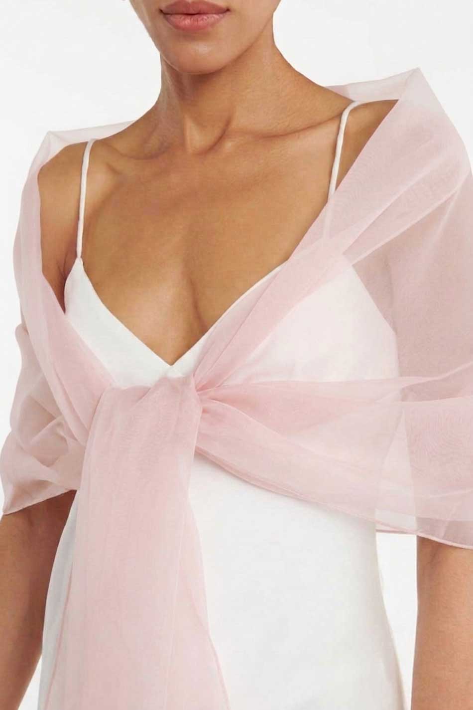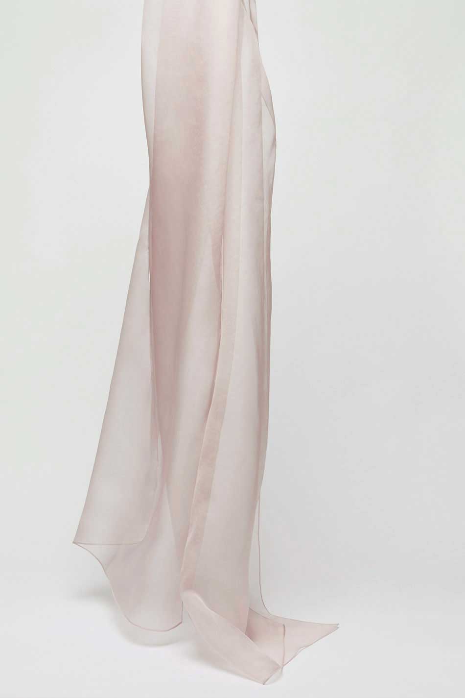 Długi szal w odcieniu bardzo jasnego różu to subtelny i elegancki dodatek, który pięknie dopełni każdą stylizację. Jego delikatna, półprzezroczysta struktura z organzy jedwabnej nadaje całości romantycznego, eterycznego charakteru, niczym lekka mgiełka. Doskonale sprawdzi się jako uzupełnienie sukienek wieczorowych, ślubnych oraz bardziej minimalistycznych, codziennych zestawów. Swobodnie zarzucony lub przewiązany na ramionach podkreśla sylwetkę, dodając stylizacji lekkości i subtelnej elegancji. Organza jedwabna, z której został wykonany, jest niezwykle lekka, delikatna i efektowna w odbiorze. ELEGANCKI DODATEK!