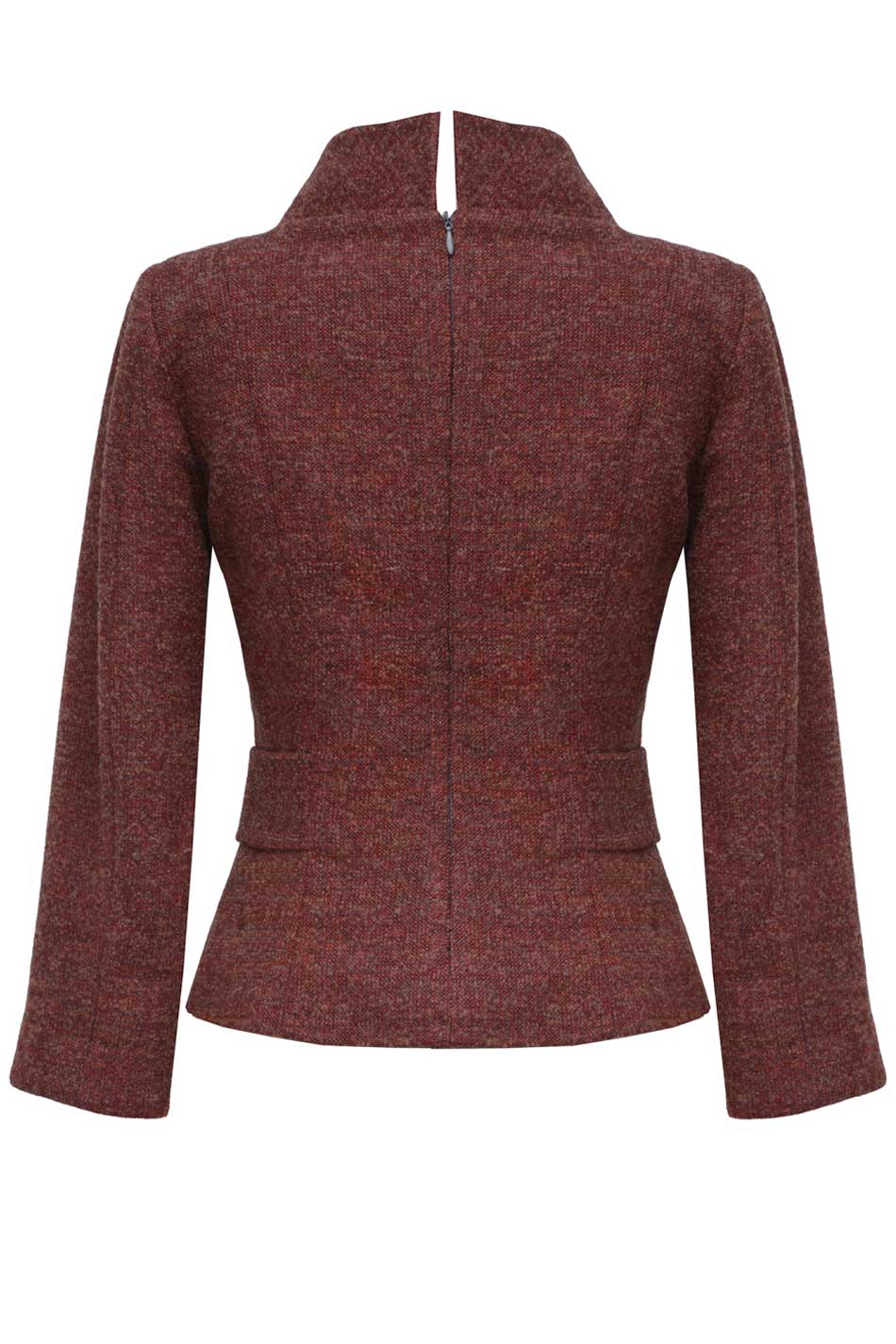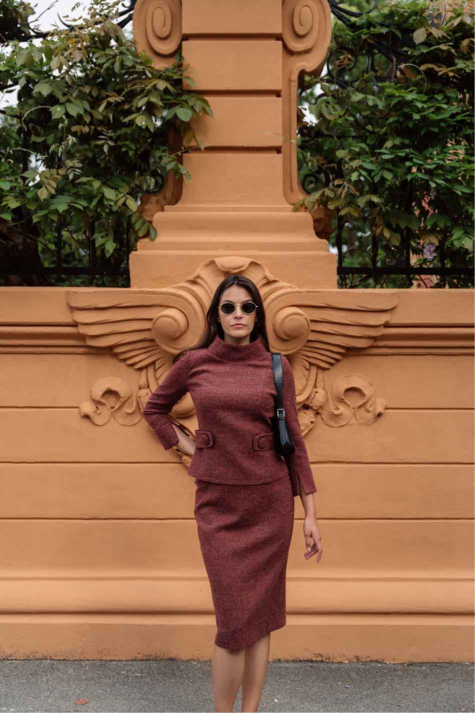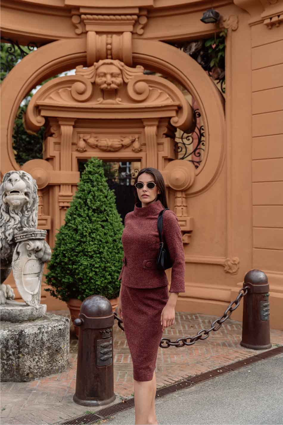 Żakiet Amal bordo to wyrafinowana propozycja stworzona z luksusowej, włoskiej wełny parzonej w głębokim, szlachetnym odcieniu bordo. Tkanina ta zachwyci swoją miękkością, eleganckim połyskiem i trwałością, gwarantując nienaganny wygląd nawet przez cały dzień. Krótki, dopasowany fason tego żakietu pięknie podkreśli talię i nada sylwetce harmonijnych proporcji, a rękawy o długości 3/4 wprowadzą lekkość i nowoczesny charakter. Minimalistyczna forma modelu została przełamana wysmakowanymi detalami – delikatną stójką, satynowym podszyciem mankietów oraz efektownymi guzikami oblekanymi tkaniną, które stanowią subtelny akcent podkreślający jego unikalny styl. Wewnętrzna, elastyczna podszewka zapewni idealne dopasowanie i komfort noszenia, a precyzja wykonania widoczna jest w każdym detalu. Żakiet Amal bordo doskonale dopełni stylizacje biznesowe i eleganckie zestawy na wyjątkowe okazje. W połączeniu ze spódnicą Amal bordo stworzy ponadczasowy komplet o wyjątkowym charakterze. SZLACHETNY!